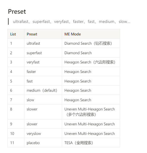 笔者本以为在 ultrafast 等较快的 Preset 模式下 ME 是不会开启的,但后来翻看源码发现:在所有 Preset 模式下都会启用,同时会根据 Preset 档次来选择对应的 ME 算法(diamon,haxgon,umh 等)